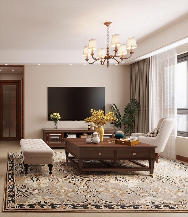 空間的整體布局散發(fā)著古樸的味道。復古的地毯、線條流暢的原木茶幾以及典雅的沙發(fā),讓客廳變得端莊且富有詩意。