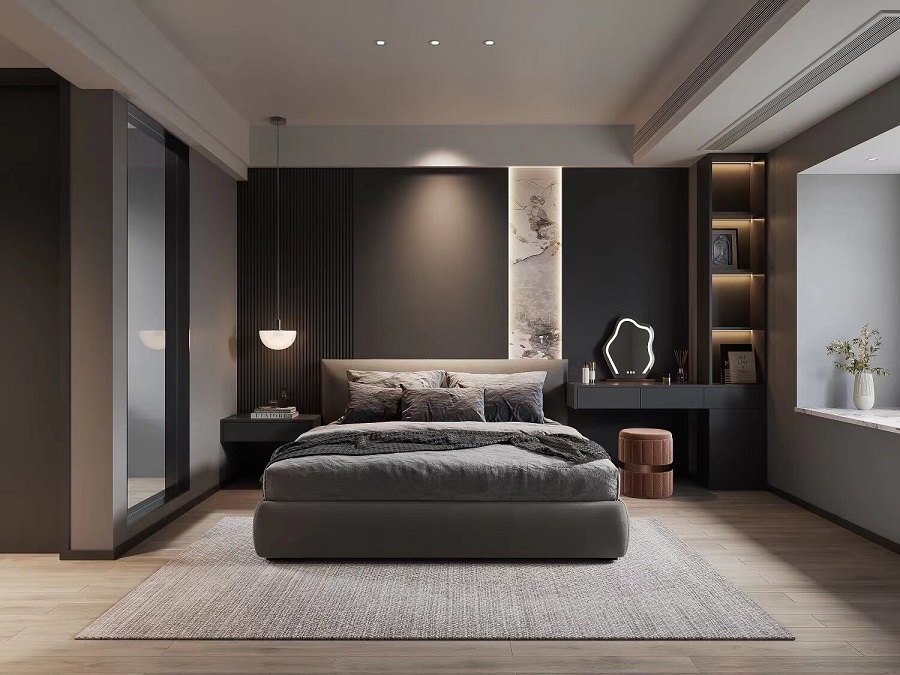 臥室風(fēng)格和客餐廳保持統(tǒng)一,在材質(zhì)上選用了了木飾面去處理,讓空間層次更豐富,增加溫潤(rùn)質(zhì)感。
