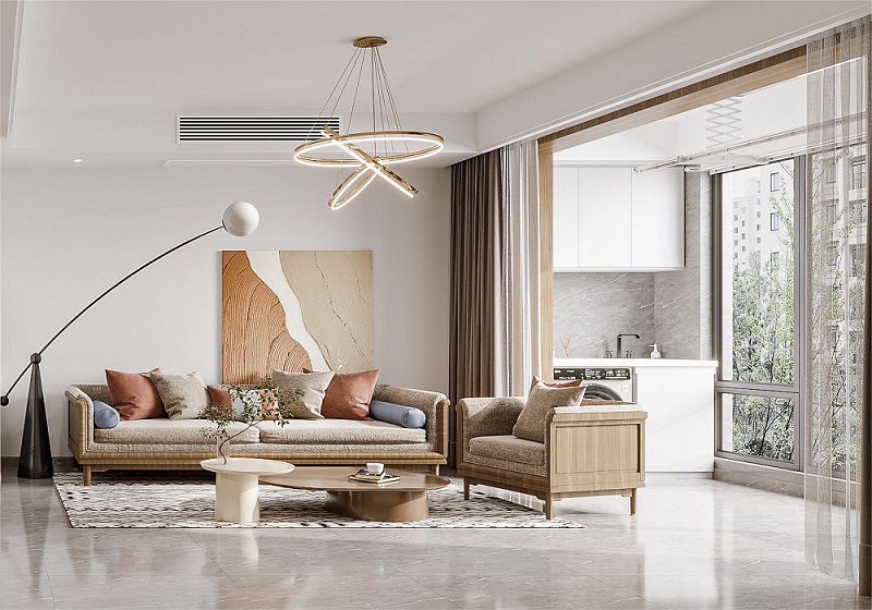 色彩相近、質(zhì)感相異的電視背景墻與沙發(fā),在對(duì)立統(tǒng)一中創(chuàng)造出一種自然的和諧。