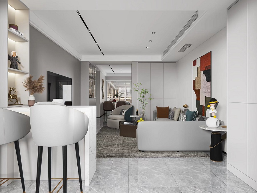 簡(jiǎn)約舒適的空間下,以淺灰色布藝沙發(fā),搭配深灰色地毯與質(zhì)感的多邊形茶幾,角落的大綠植點(diǎn)綴,為空間增添一抹色彩。